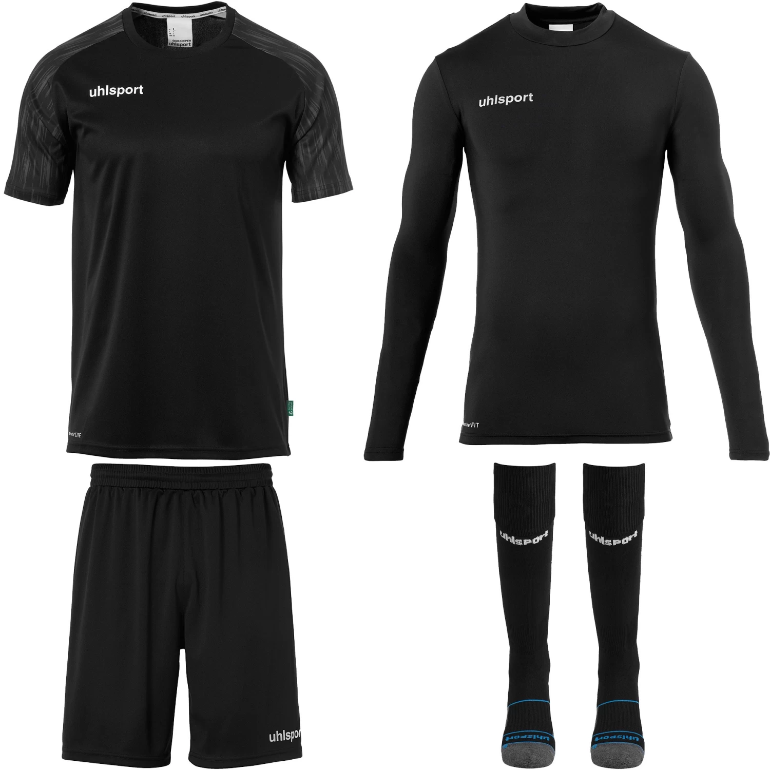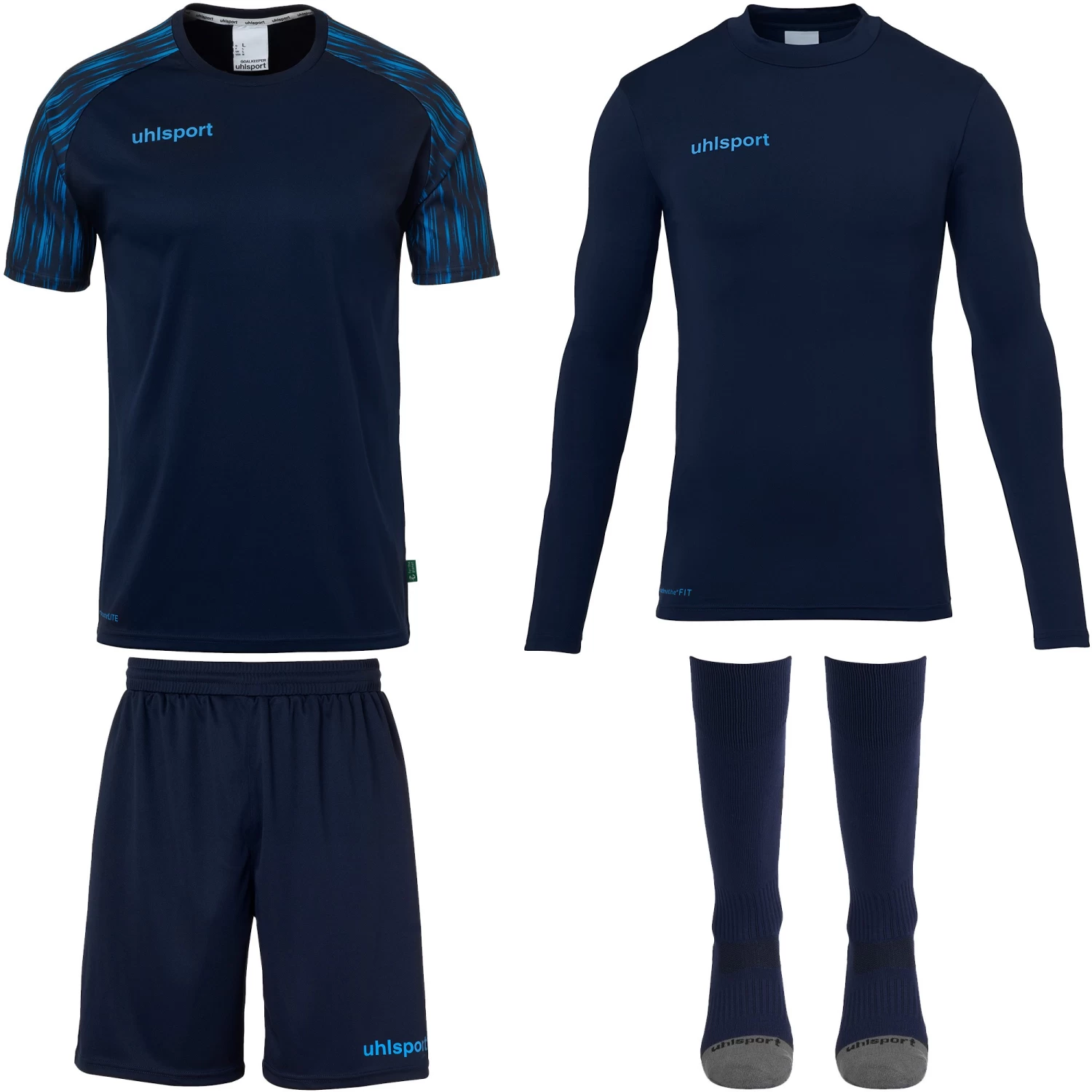 Cet ensemble pour gardien de but est composĂ© d’un maillot, d’un short, d’un baselayer et de chaussettes hautes.